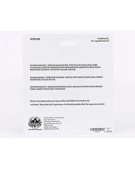 Welcome to the twisted circus! This scary clown makeup kit is the perfect way to make your scary clown costume even more terrifying! With two body crayons, white face powder, fake blood and a sponge, you’ll be able to get the look you’ve been dreaming of.