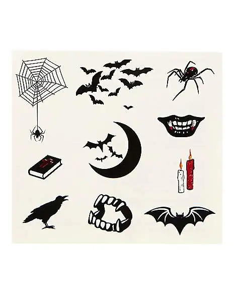 Add a fun element to your vampire look with these vampire temporary tattoos! These easy-to-use tattoos feature a variety of images, from a mouth with fangs to a coffin to a skull with a black bird on it, plus bats, a spider web, and a candle for lots of variety.